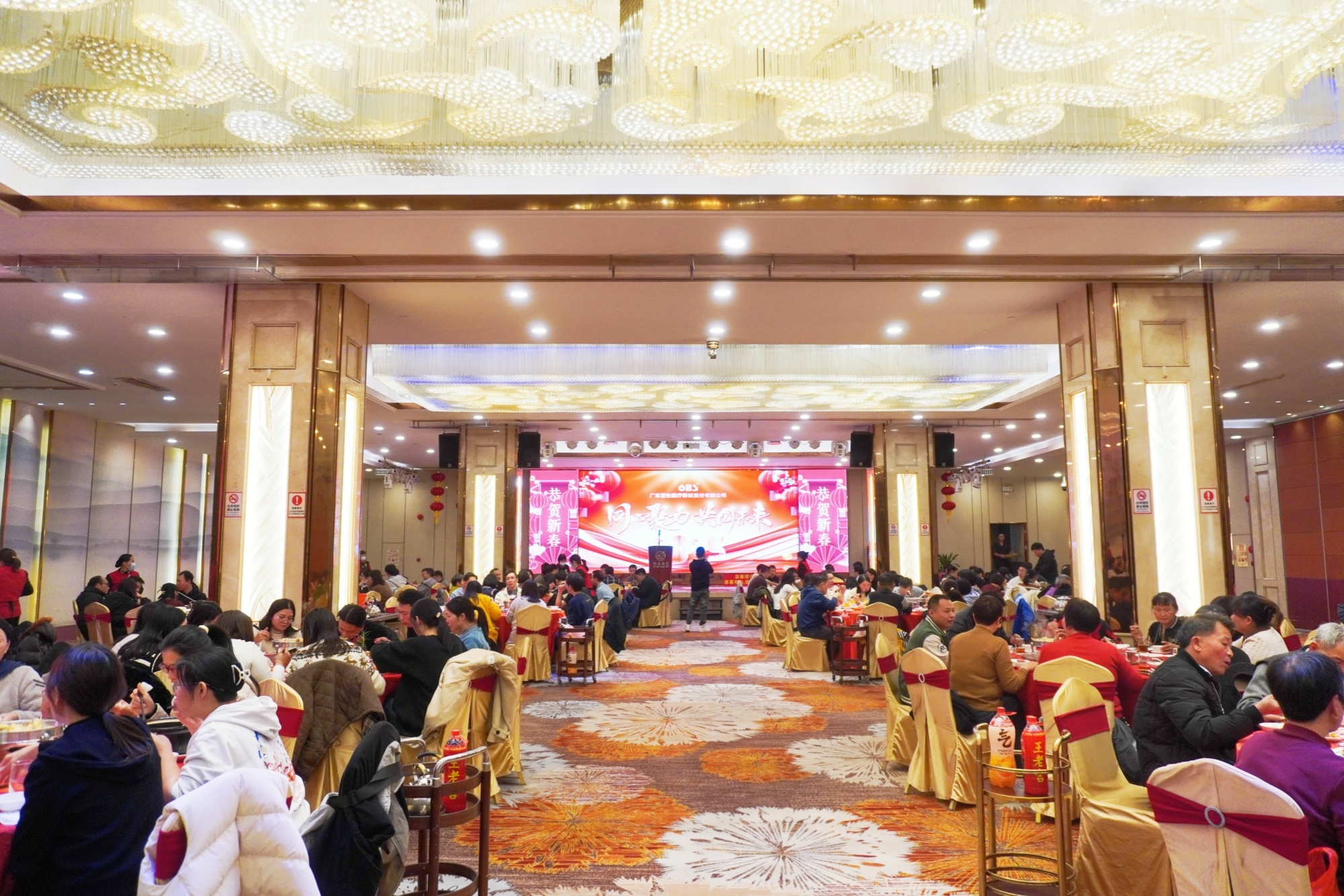 当晚,华灯初上,酒店内灯火璀璨,气氛热闹非凡。百生家人欢聚一堂,现场欢声笑语,大家举杯同庆,共同迎接百生更加辉煌灿烂的明天!
